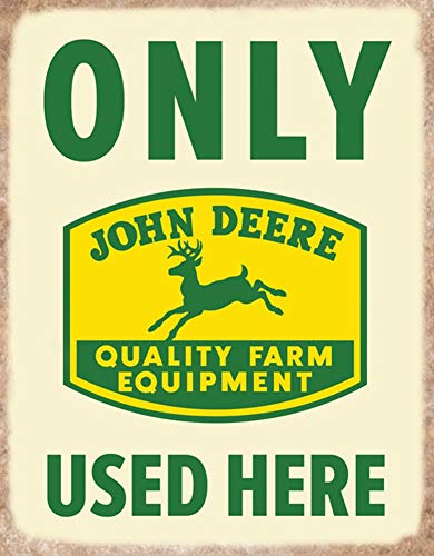 This metal sign reads "Only John Deere Quality Farm Equipment Used Here". A vintage John Deere logo from the early 1950s is in the center of the sign. Official licensed product.