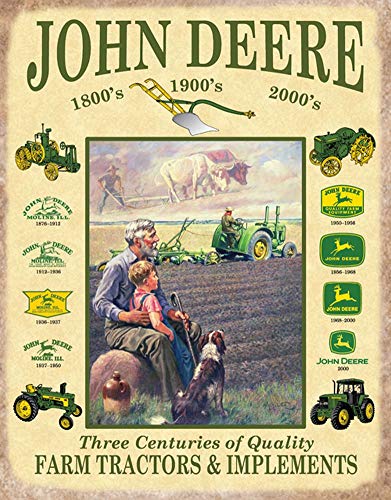 This metal sign features the artwork of Walter Haskell Hinton, showing three generations of farmers: a grandfather and child watching the child's father plow a field on a John Deere tractor. Hinton created several advertisements for John Deere, and one of his paintings featuring a leaping deer was used as the inspiration for the Deere logo in the middle part of the twentieth century. Various John Deere logos and tractors line the sides of the sign, and it reads "Three Centuries of Quality", "Farm Tractors & Implements" at the bottom.