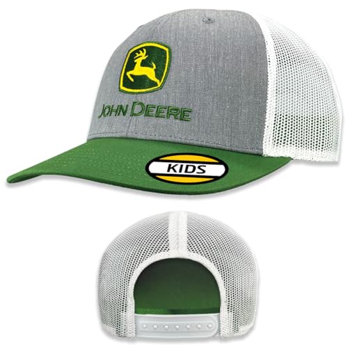 Classic Deere logo embroidered on grey front hat with white mesh. Kids/Youth Sizing. Snapback closure.