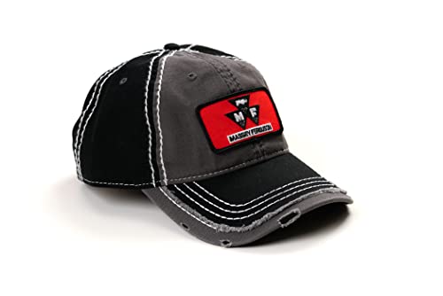 Gray and black distressed hat displaying the red Massey Ferguson logo. Hook and loop (Velcro-style) size adjustment. One size fits most adults. Licensed product.
